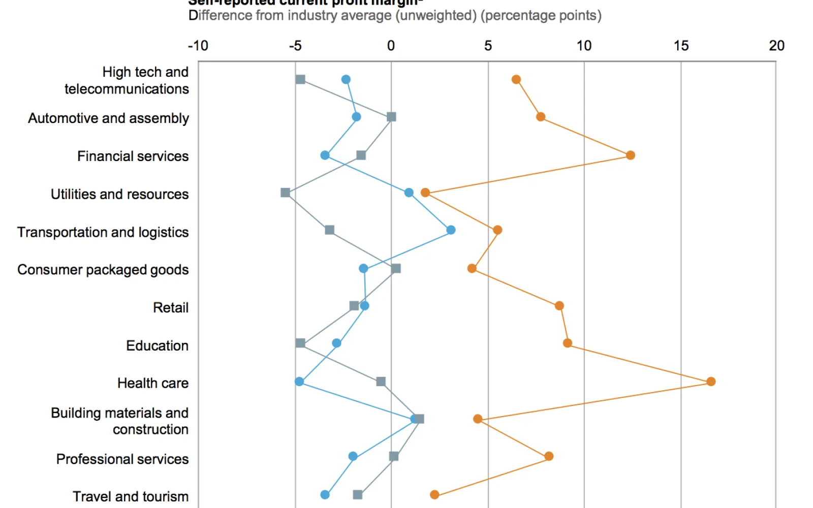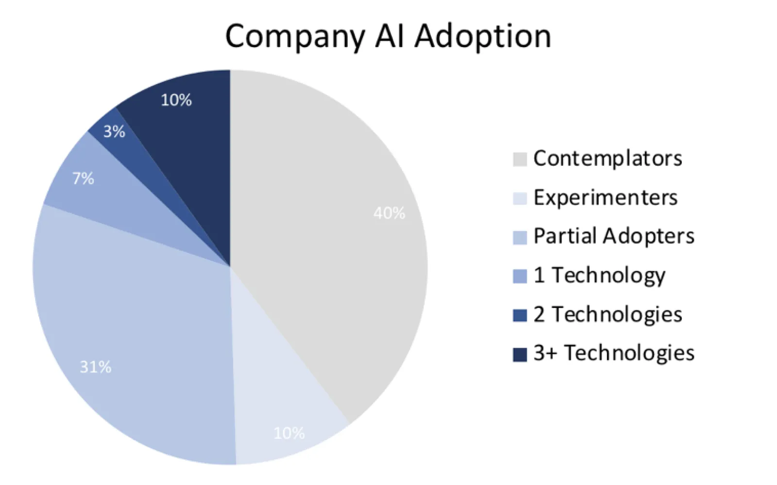 There is plenty of room for growth. Today, only 20% of companies have begun to integrate AI in their business, though these early adopters are adopting it quickly — half of them already have three or more AI systems in place. Early results suggest AI adopters are already seeing returns on their investments. 30% report revenue increases, and early adopters with “strong digital capability [and] proactive strategies have higher profit margins and expect the performance gap with other firms to widen in the next 3 years”. The gap is widening at an industry level, too, as industries with high adoption are increasing investment at a much quicker pace than others.