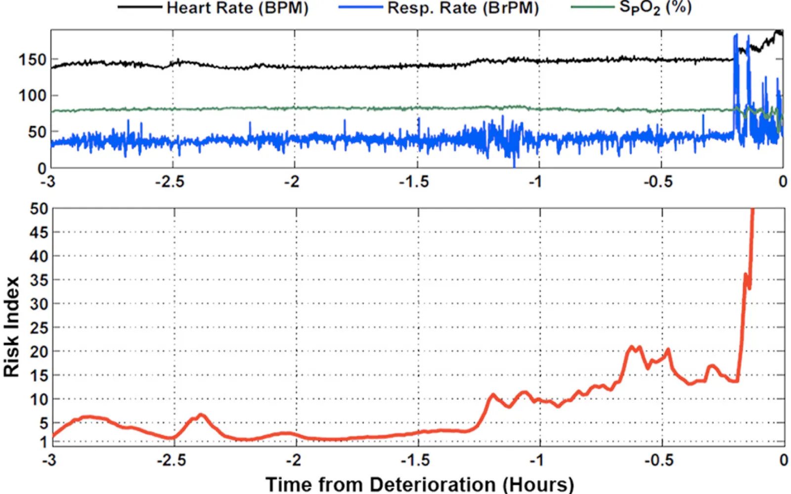 This saves lives. The chart below shows a MIC-informed risk index for a baby with a severe heart defect. While it tracks three common vital signs at the top, the model also draws on respiratory rate variability, specific heart rate interval variability, and heartbeat segment length and variability. Many of the best predictors of a critical event are hidden, and examining each signal alone doesn’t show the whole picture. By running real-time analysis on vitals data, doctors catch invisible red flags and intervene.